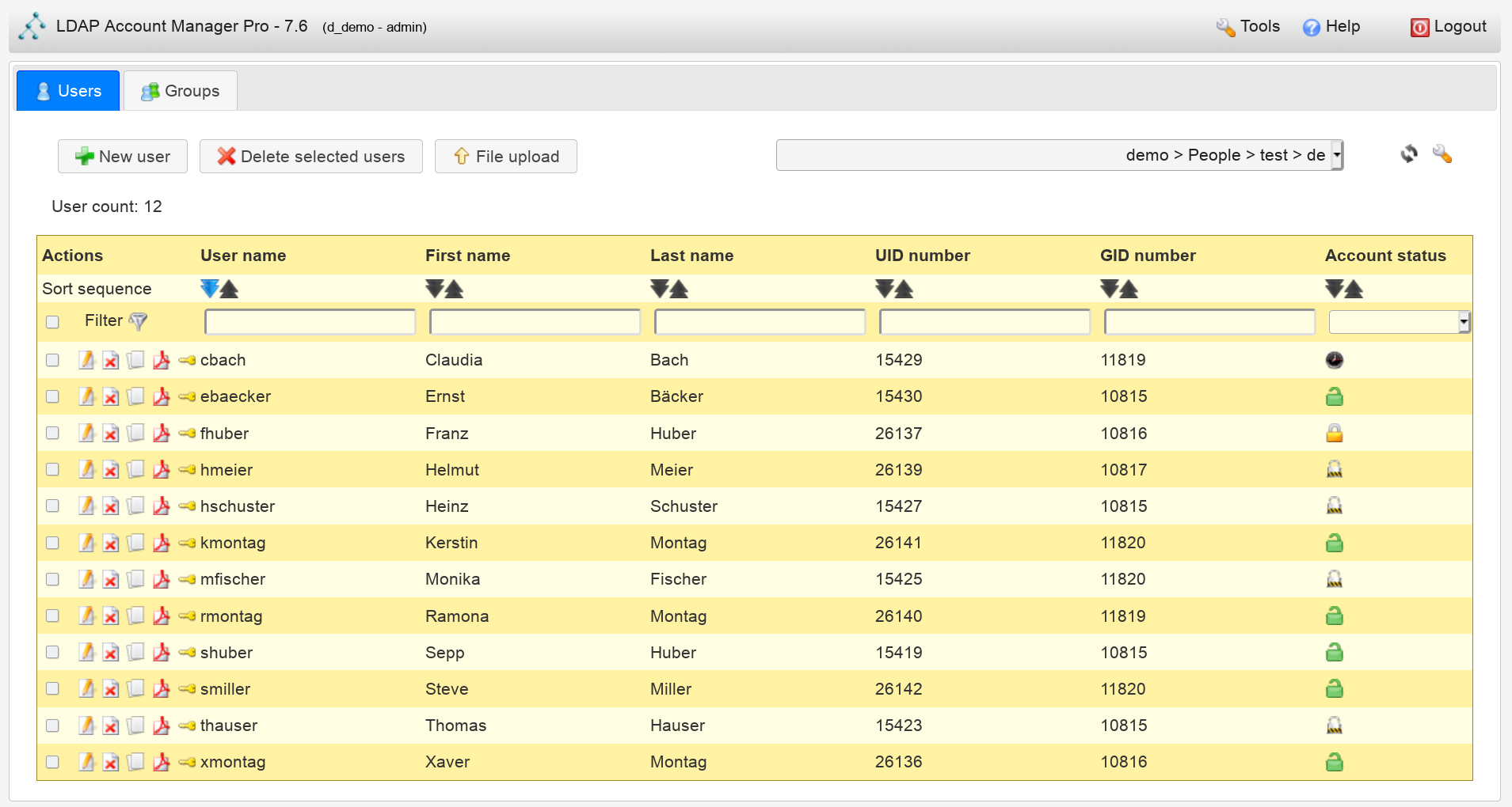 The header part includes the links to manage all account types (e.g. users and groups). There is also the logout link and a tools entry.