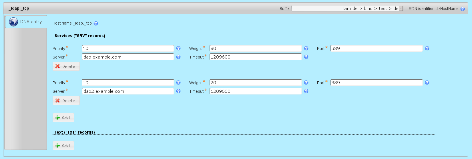 Service records can be used to specify which servers provide common services such as LDAP. Please note that the host name must be _SERVICE._PROTOCOL (e.g. _ldap._tcp).